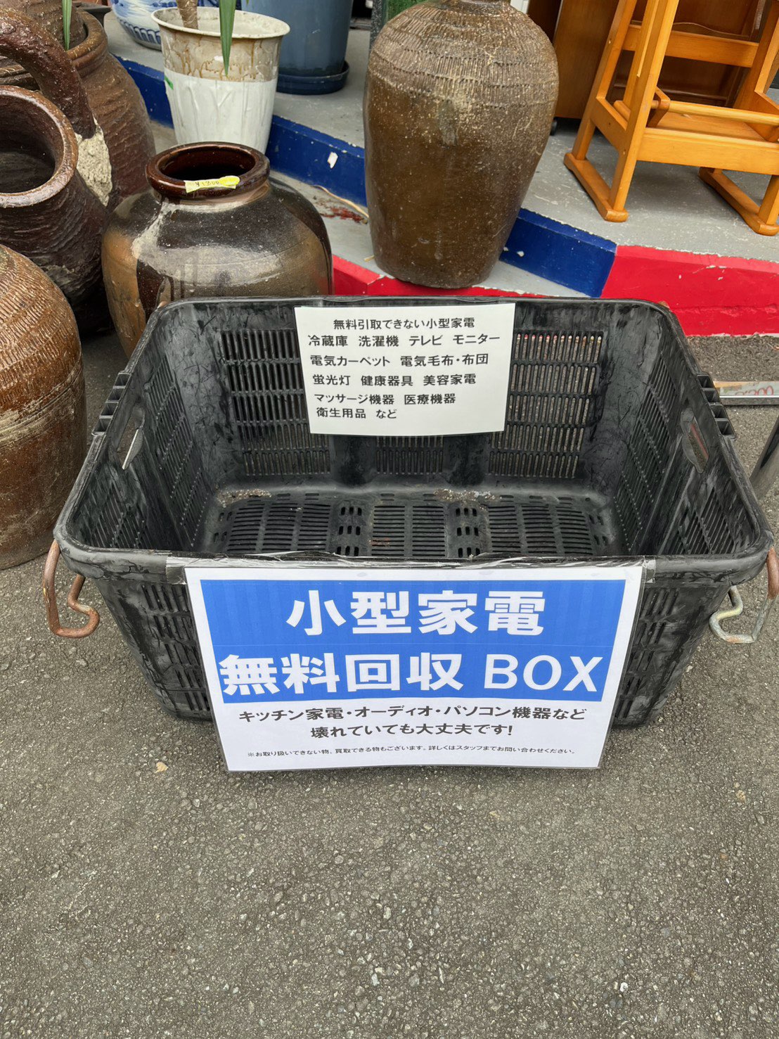今まで店頭査定にお持ち込みいただいた小型家電のうち、買取りのお値段がつかなかった場合はお持ち帰りいただいておりましたが、これからはこちらのボックスに置いて行っていただけるようになりました!