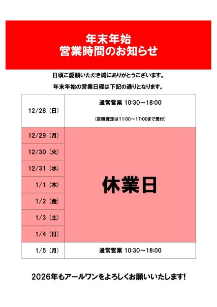 一足早いですがリサイクルセンターアールワン全店舗、年末年始の営業時間のお知らせです。