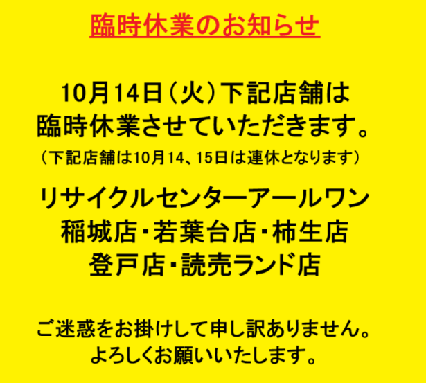 アールワン東京多摩地域の全店舗、都合により10月14日(火)は臨時休業させていただきます。